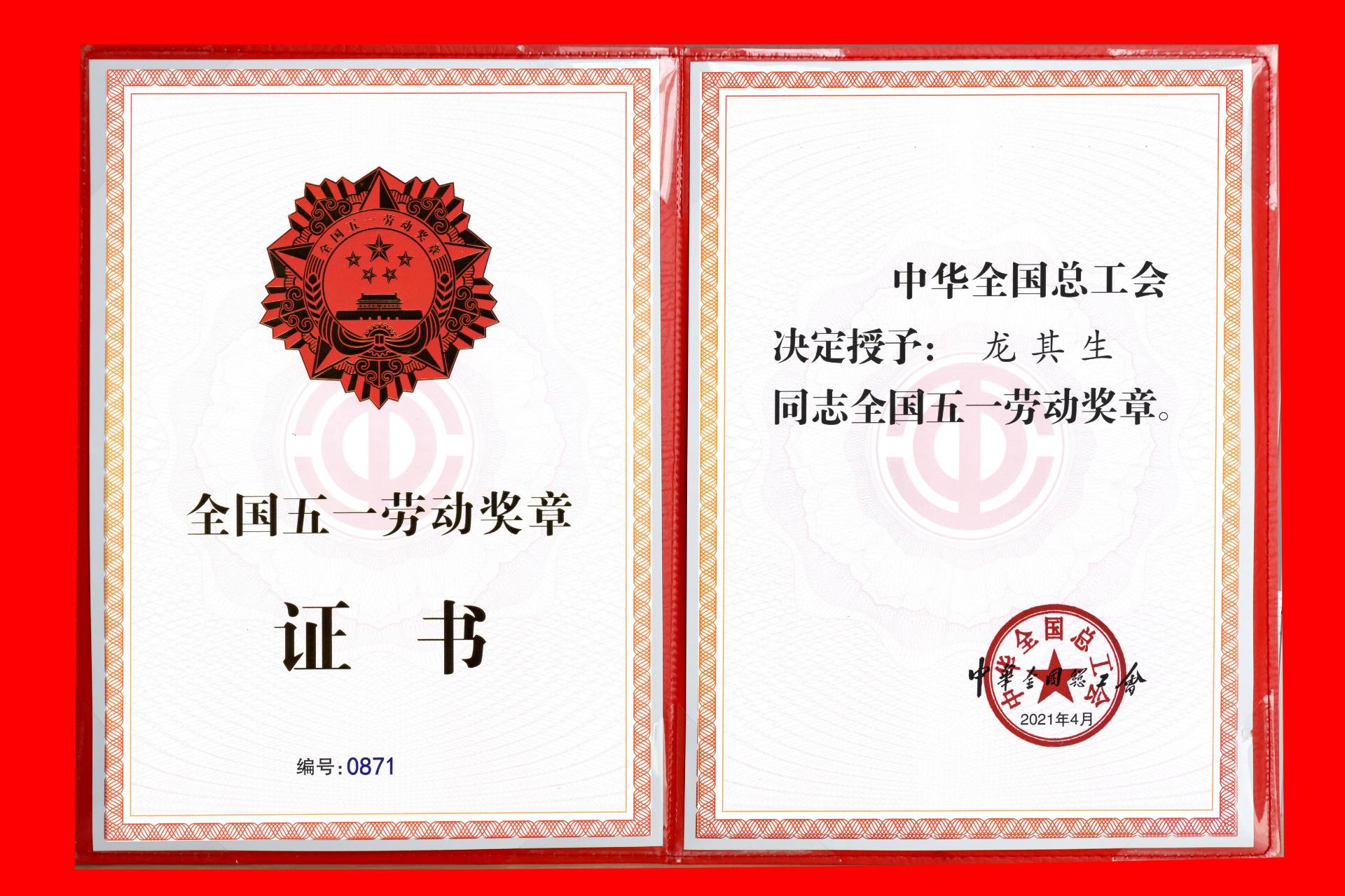 龍其生董事長(zhǎng)榮獲2021年全國五一勞動(dòng)獎(jiǎng)證書